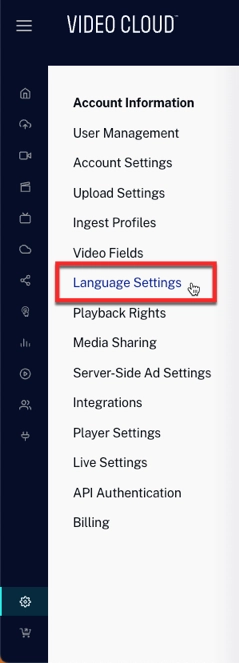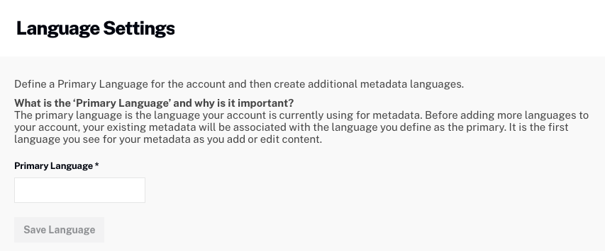 The Language Settings is where you define a Primary Language and then add and manage additional metadata languages. The Primary Language is the language your account is currently using for video metadata. Before adding additional languages to your account, your existing metadata will be associated with the language you define as the Primary Language. The Primary Language is what is initially displayed when you edit video properties in the Media module.