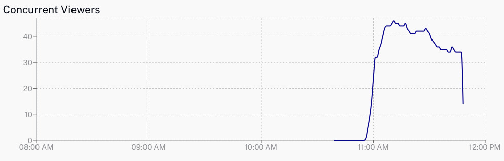 Un graphique affichant les visionneuses simultanées s'affichera sous l'instantané. Les visionneuses simultanées mesurent le nombre de sessions connectées au flux à un moment donné, quelle que soit leur position. Par exemple, si 10 utilisateurs regardent le flux en direct sur le bord en direct et que 5 utilisateurs regardent dans la fenêtre DVR (10 minutes de retard en direct), les spectateurs simultanés pour la minute seront de 15 utilisateurs.