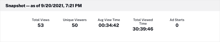 Le module Live fournit des rapports sur les événements de diffusion en direct ou les performances des chaînes. Des informations telles que des spectateurs simultanés en temps réel et des données post-événement agrégées sur la durée du streaming, la géographie et les appareils du spectateur sont disponibles.