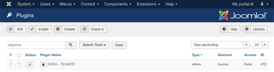 The TinyMCE editor will also strip out the <script> tag when using the Advanced (in-page) player publishing code. One way around this is to configure your Joomla instance to not use the TinyMCE editor. To select another editor, follow these steps: