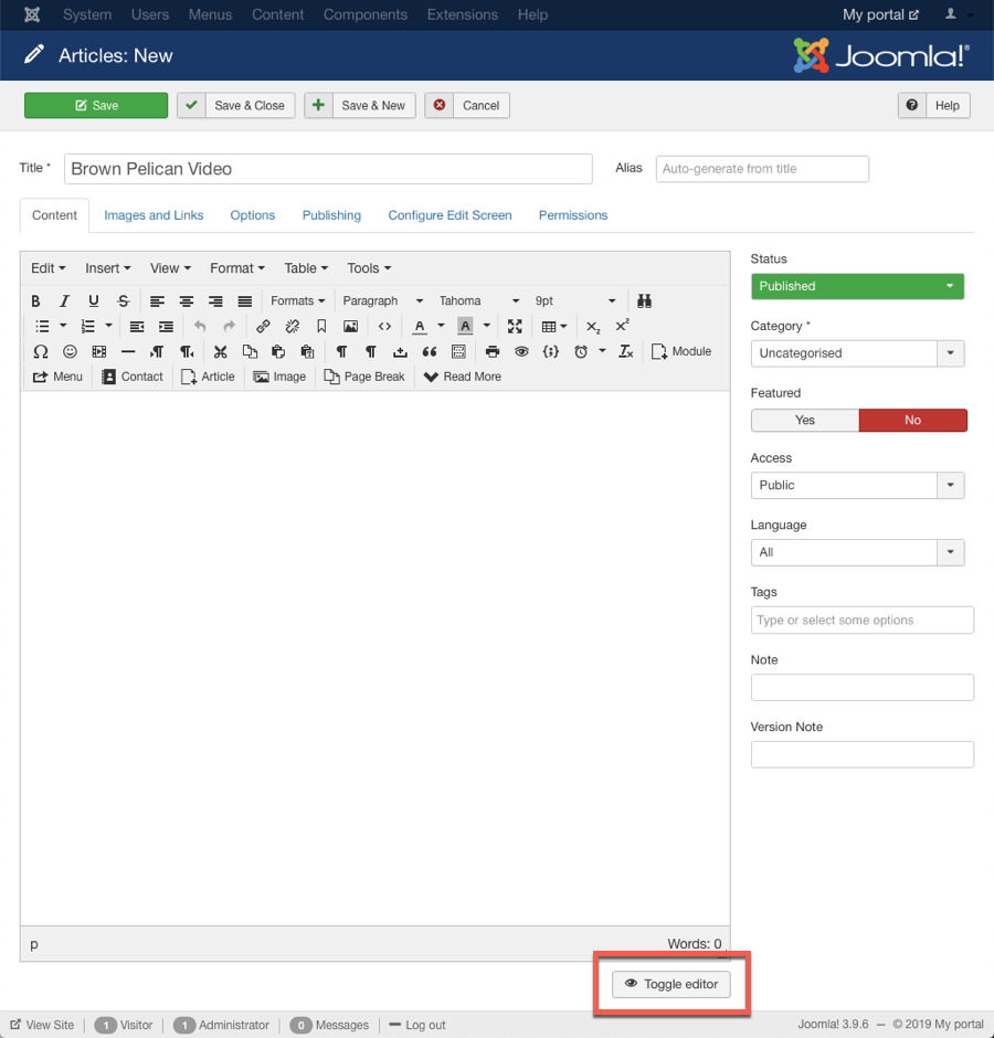 By default, Joomla is configured to use the TinyMCE editor. The TinyMCE editor is configured to strip certain HTML tags when they are pasted into the editor. In order to paste in the Standard (iframe) player publishing code into the Joomla editor, you need to make sure that the <iframe> tag will not be removed by the editor.